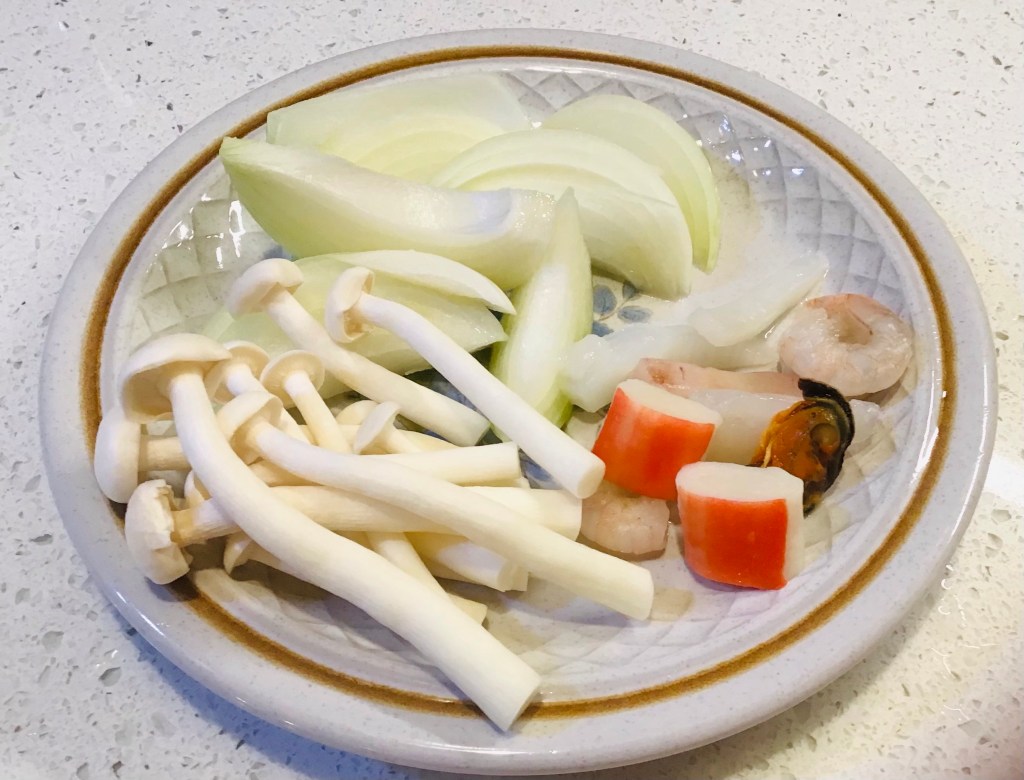 升級版:材料:洋葱,新鮮菇,混合海鮮