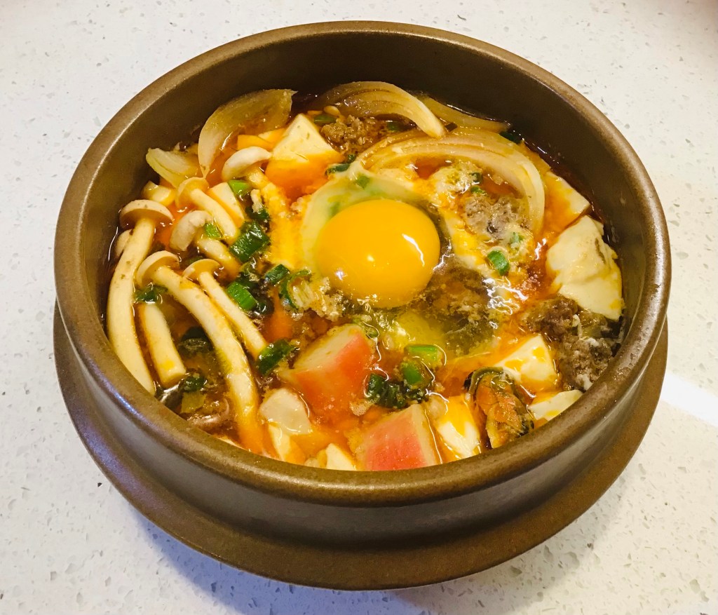 When I make the tofu soup for the whole family in a busy night, I simply make it in a big pot and add 3 eggs on top. It is not a perfect presentation but it still looks good and tastes great. For the “upgraded “ versions, besides seafood, you can add sliced beef, pork or chicken, You can add kimchi to the soup too.